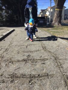 お散歩カーから下りて保育者やお友だちと手をつないで歩き、一緒に鳥を見たり清掃車を見たり‥‥。公園では木の影に隠れて「ばあ❗️」と顔を出してケラケラと笑い合ったり。