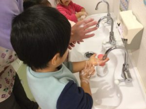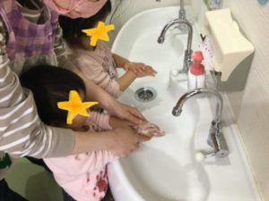 小さいお友達は、石鹸をつけて手洗いをがんばりました😉