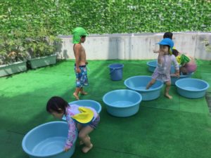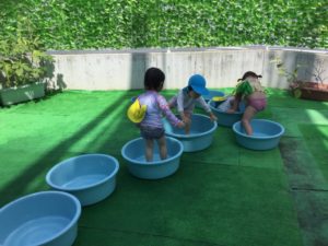 Kちゃんが「ここに置いて」Tくんが「ならんだー」協力して一列に並んだタライ。その中に1歳児のHちゃんが入って「きゃっきゃっ」と嬉しそう。MちゃんとRちゃんはタライをつたってひとつひとつに順番に入り、大笑いでした。Rくんは並べ終わった後はスプリンクラーの研究かな❓