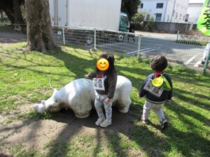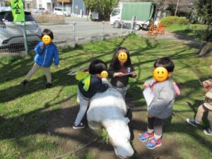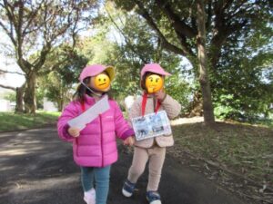 公園に行ってはじめてのウォークラリーをしました。公園で撮った写真を4か所ずつ1枚のカードにして、そのカードを首からぶら下げお友達と手を繋ぎ探しに行きます。「探しに行くぞ!」「おっー!」と掛け声をあげやる気満々の子どもたち😆✨