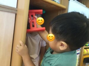 棚のネジひとつから遊びを発展させ協力して本当にひとつの棚を作っているようで子どもの想像力に驚かされたひとコマでした。