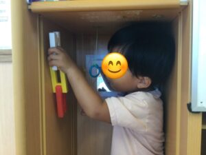 この日は棚のネジを見つけてトンカチやドリル、DIYの工具に見立て遊んでいました。