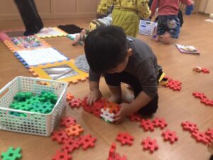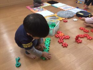 1歳児のSちゃんも自分で繋げています.最後に付け終わると「よし!」と満足そうです。