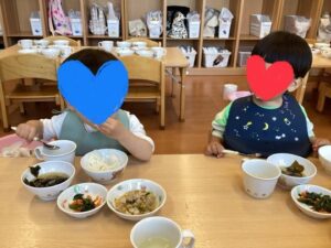 デザートを食べ終わり、お茶を飲んでいるA君。保育者の顔を見ながらニヤリ😎「今からやるぞー」と言わんばかりの顔でニヤニヤして、お茶のコップに口をつけると、ブクブク〜‼️