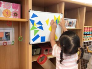 Cくんは、丸い形の磁石だけを選んで並べ始めました。どうやら料理をしているようです。「ハンバーグだよ〜」と言ってちゃんとひっくり返しながら、焼きあがると保育者やお友だちに分けてくれました。