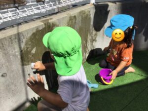 また別の日、水鉄砲が大好きな子どもたちは壁に向かって水をかけています。水で壁の色が変わるのを楽しんでいるのです❗️