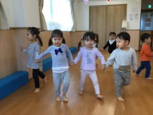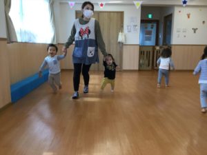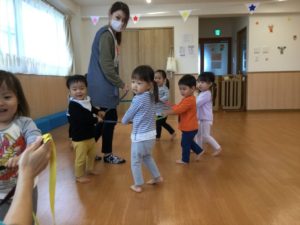 最初は『どんぐりころちゃん』のわらべうたで身体を動かそう😊