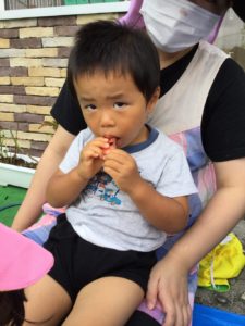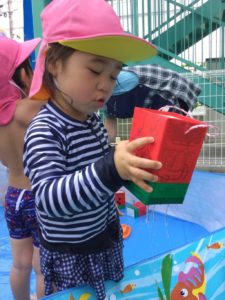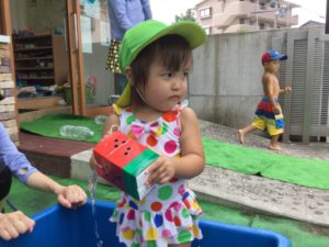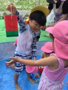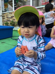 さあ、作ったスイカシャワーで遊ぼう‼️