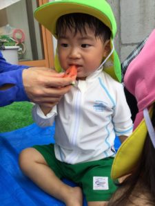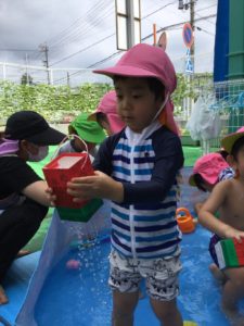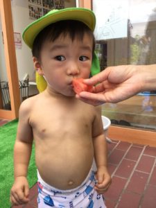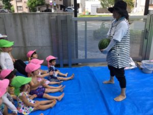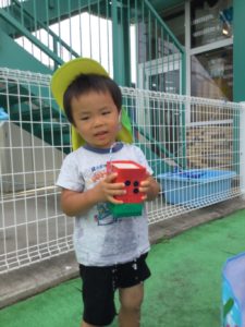 さあ、作ったスイカシャワーで遊ぼう‼️