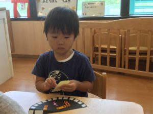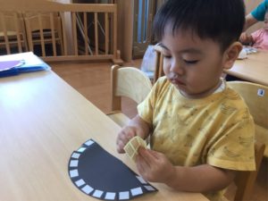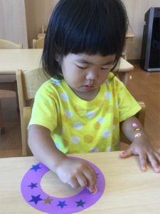 次はカボチャのお化け🎃がかぶるお帽子にシールを貼ろう‼️