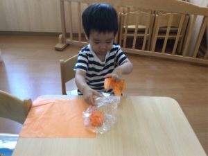 最初はオレンジのお花紙を丸めて袋にいれよう😄