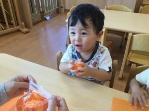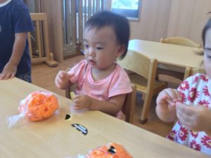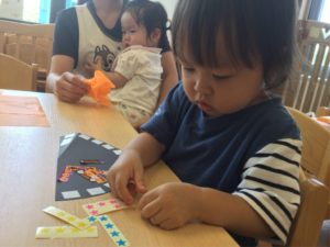 次はカボチャのお化け🎃がかぶるお帽子にシールを貼ろう‼️