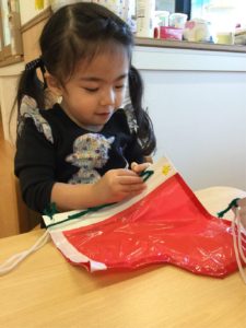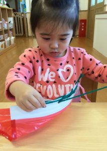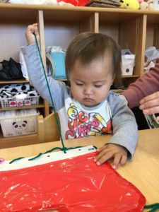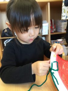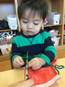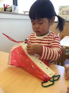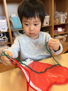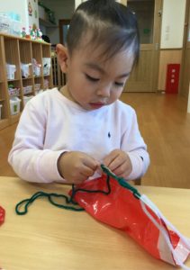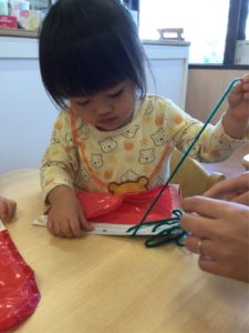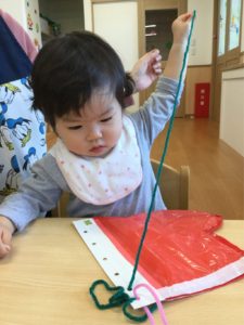 小さな穴にひもをとおしたら、ひもをひっぱって〜〜😙