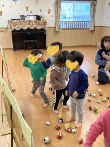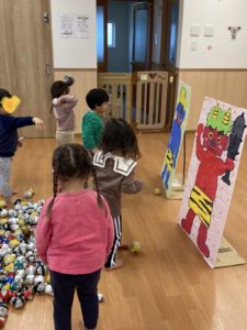 先日豆まきの日の練習で、鬼退治をやりました。段ボールの鬼に向かって新聞を丸めた豆をぶつけて鬼退治‼️「おには〜そと💨」と言いながら、豆をぶつけました。