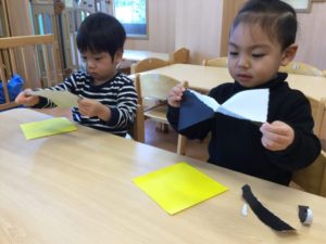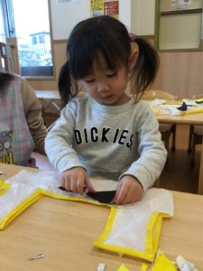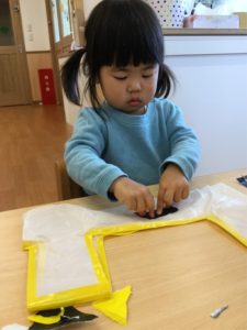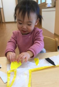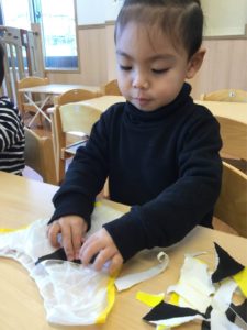 鬼の衣装にちぎった折り紙を貼ろう😃