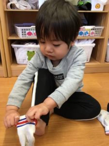 お散歩の準備をしよう❣️ 靴下上手にはけるかな😙