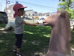 お馬さんの横にちょこんと座って何しているのかな😙
