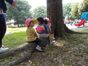 1歳児のAちゃんが公園中をあちこち探索していると、大きな木があるのを発見❗️