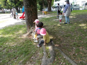 そこへAちゃんが座っているのを見て、Ak君も木の根に跨がって座りました。電車の大好きなAK