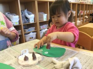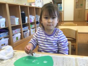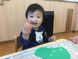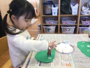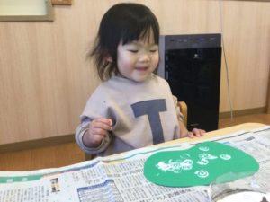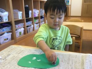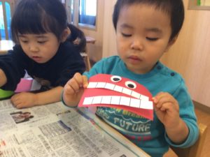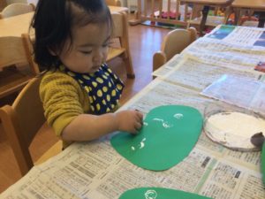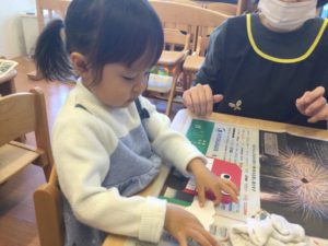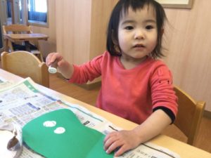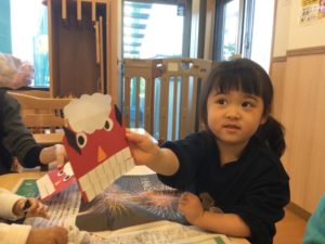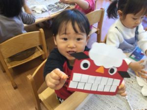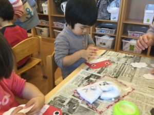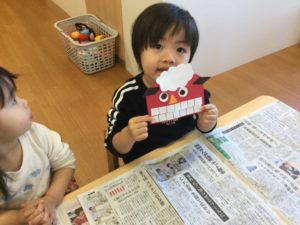 今日はかわいい獅子舞を作ろう😆 目や口をのりでペッタン貼ろう❣️
