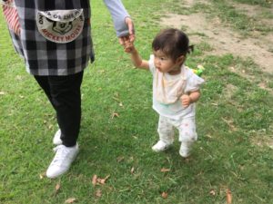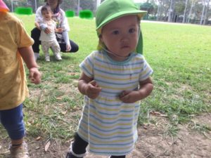 おおかば公園についたら、さっそく葉っぱの絨毯の上をふみふみ