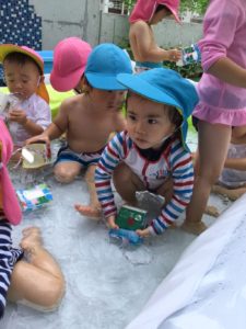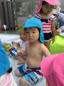 座りこんでプールのお水とすっかり仲良し💕😃💕