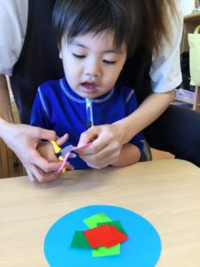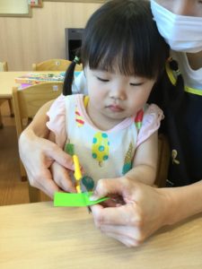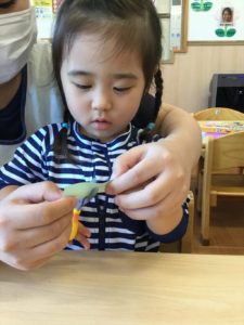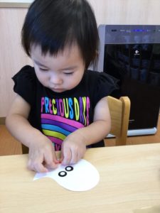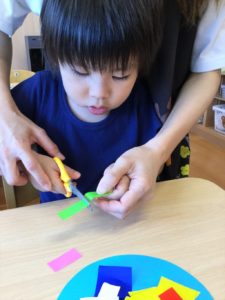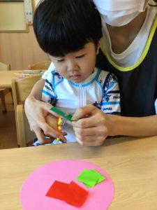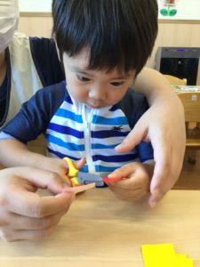 2歳児のお友だちは、ハサミを使って折り紙を切ろう✂️