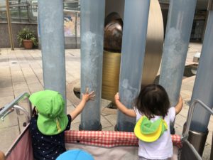 と少し距離を離して抱っこされて水を触りましたが、筒状のガラスの中で水が吹き上がる噴水は触っても濡れないということで目を輝かせてゼロ距離で抱き締めて見ていました💓