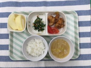 鶏の唐揚げ、しらす和え、りんご🍎