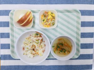 春野菜チャーハン、えのきのスープ、