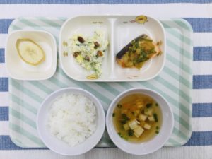 ごはん、すまし汁、鮭のちゃんちゃん焼き、