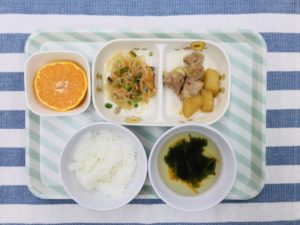 ごはん🍚、わかめスープ、鶏肉の甘煮