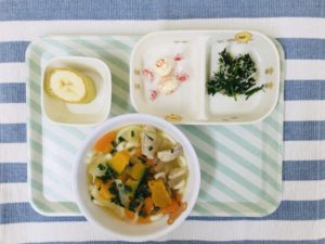ほうとう風うどん、ほうれん草とえのきのお浸し、