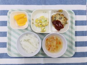 ごはん、野菜スープ、豆腐ハンバーグ、