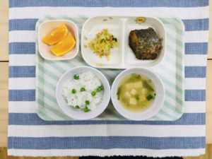豆ごはん、味噌汁、鰆の照り焼き、
