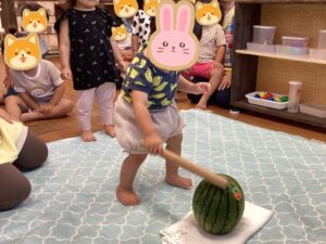 また力強くすいか🍉を叩く2歳児の子どもたち‼︎