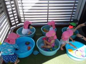 梅雨が明けると暑い日が続き子どもたちは一人一人のタライで色々な玩具で水遊び!