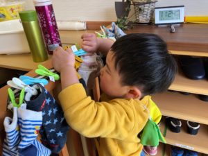 今日は洗濯ばさみを使って、靴下を自分で付けてみたよ!