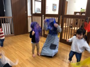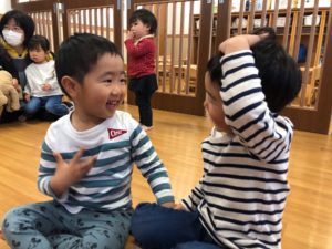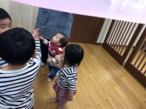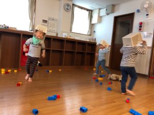 お給食後に、「雨だー!」といってカゴを被っていたお友だちたち…😄❤️