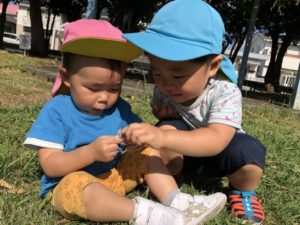 この日は1歳児のTくんが、0歳児のRくんの元へ「Rくーん😊💓」と遊びにきていました。「何してるの?」「葉っぱどーぞ!」と、色々と気にかけてくれていました。