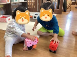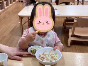 1歳児は、簡単な会話で友だちとやり取りが出来るようになったり、身の回りのことを『自分で!』と、なんでもやってみようとしたりしています。自分で出来ることも増えて、自信に繋がっているようです。