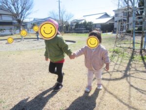 2歳児は、身の周りのことがほとんど自分で出来るようになり、友だちと会話を楽しみながらあそんでいます。集団あそびも好きになり、かくれんぼやむっくりくまさんなどで体をたくさん動かしています。