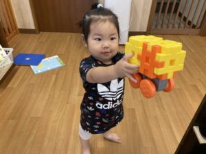 ブロック遊びが好きな2歳児のKちゃん。黄色をたくさん持って「これKちゃんの!」と近くにいる1歳児のTくんに言いながら、何かを作っていました。その頃Tくんは「救急車!」と言って保育者にブロックを手渡し作ってもらっているところでした😄