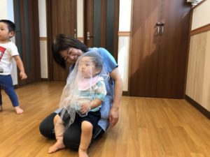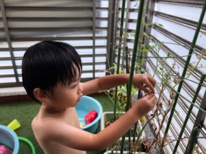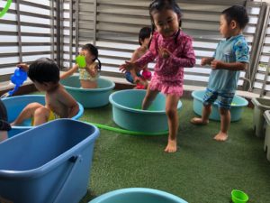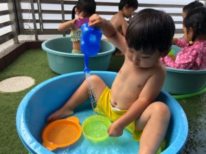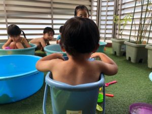 大きい子たちはお水遊び、小さい子たちは沐浴をしました😌
