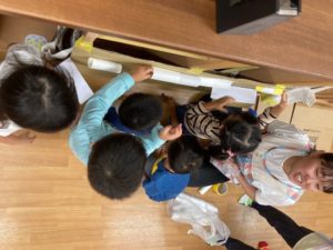 大きい子たちは、どんぐり転がしの装置を作りました✨